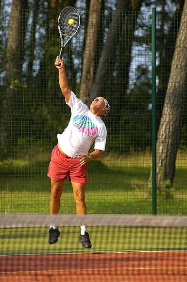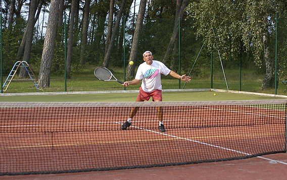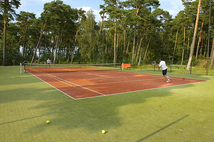 Oświetlany kort tenisowy z synetyczną powierzchnią.